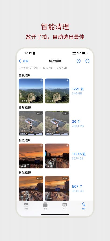 - 相册瘦身:出去玩拍了太多重复和相似照片?【照片清理】自动识别并推荐最佳保留版本,一键释放空间,让相册井井有条。