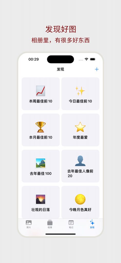 - 智能推荐:自动推荐旅行或活动中的精彩瞬间,从周末拍摄的一堆照片中,立刻找出最美9图