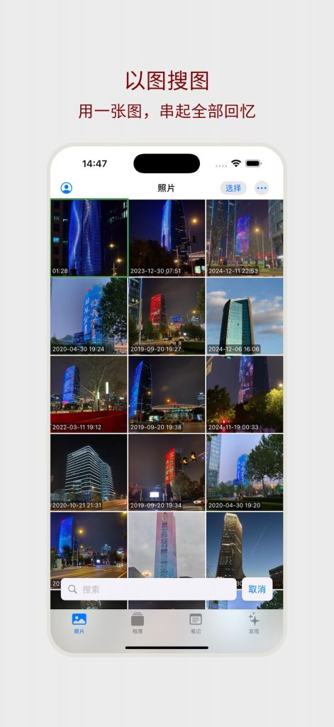 - 离线时光:飞机上发呆时,翻翻相册。文本搜图搜视频、附近照片、以图搜图,多种方式组合,让你沉浸其中。断网时本地AI模型也能提供基础的聊天识图服务。