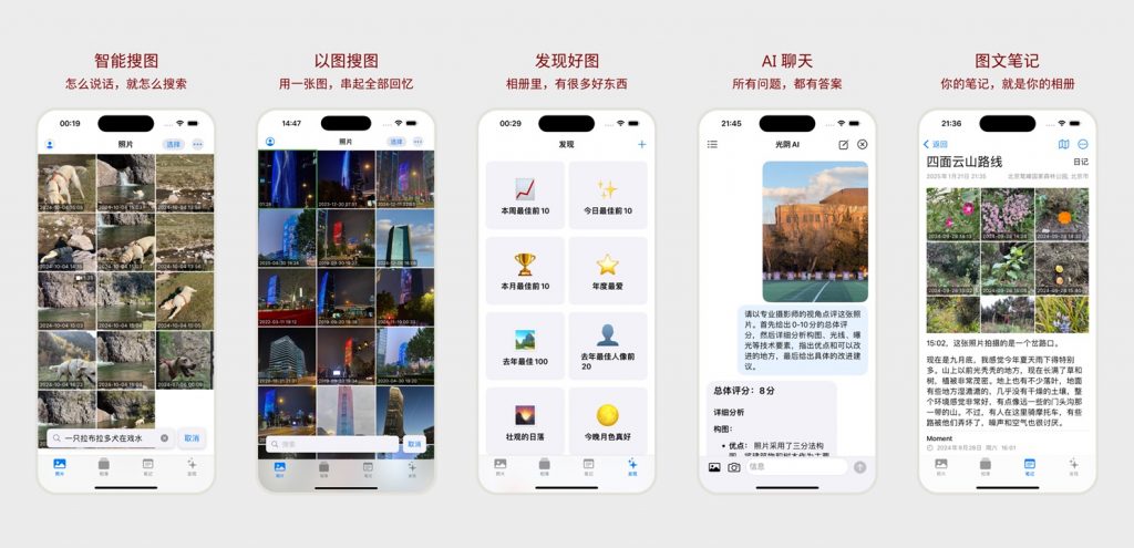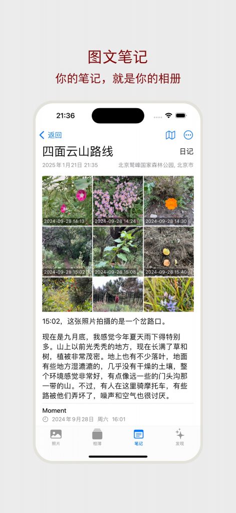 - AI 图文笔记:为照片添加文字、地点和描述,照片与笔记无缝跳转