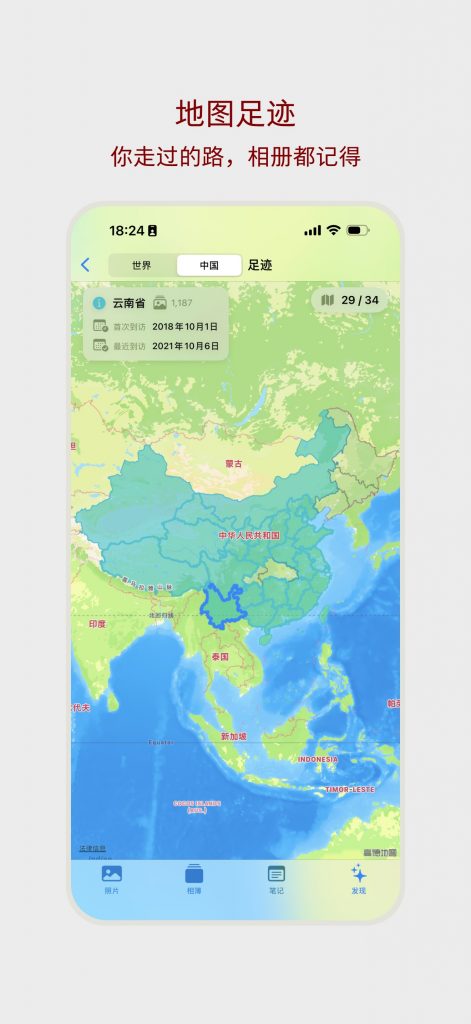 - 旅行地图:自动识别你去过的国家和省份,地图上点亮访问过的区域